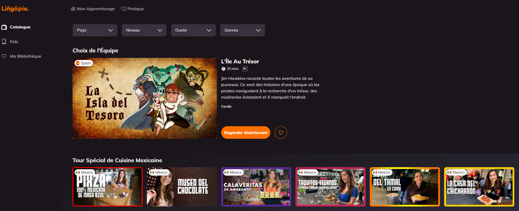 Si vous aimez apprendre à travers les films et séries, Lingopie est bien plus qu’un simple outil de traduction français espagnol : c’est une immersion linguistique. La plateforme propose des centaines de séries, documentaires et films espagnols avec sous-titres bilingues. Vous pouvez cliquer sur n’importe quel mot pour voir sa traduction instantanée, l’ajouter à votre liste de vocabulaire et l’écouter avec la bonne prononciation.
